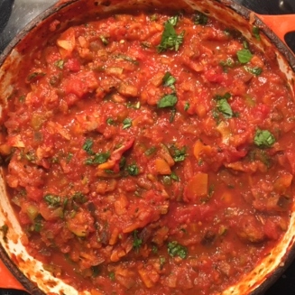Now, squeeze in your tomato puree and cook for 2 minutes, before adding the peeled tomatoes, italian herbs, sriracha and balsamic vinegar. Cook for 2 minutes, then add the passatta, turn the heat right down and cook for another 10 minutes. You guessed it – stir regularly.
