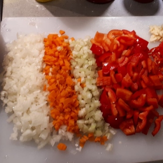 Finely chop your onion, carrot, garlic, chilli and celery, and thickly dicing your red pepper too. Heat up the olive oil in a large cast iron pan as you do so.