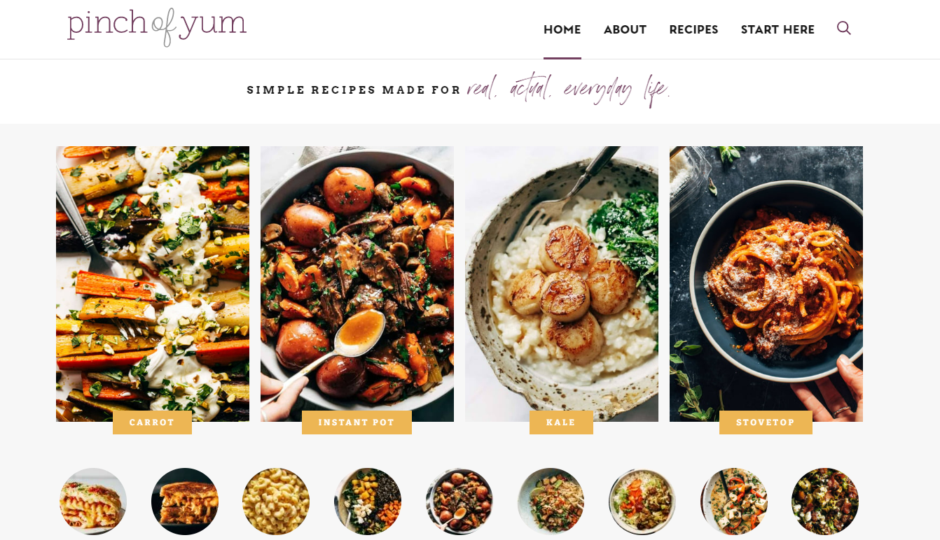 - “Pinch of Yum” is a food blog with a focus on easy, flavorful meals and delicious desserts. There is such a lot to choose from on this site it’s hard to know where to start. If you’re looking for healthy, hearty, indulgent or anything in between, you’re in luck.
